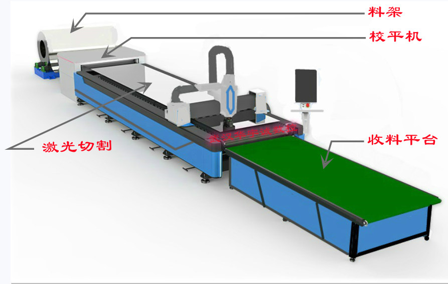 卷料備展開(kāi)后,經(jīng)過(guò)了整平這一工序,材料內(nèi)應(yīng)力便得到了大部分的消除,在通過(guò)系統(tǒng)控制的激光切割頭在激光切割平臺(tái)上進(jìn)行的三維運(yùn)動(dòng)切割,實(shí)現(xiàn)對(duì)金屬帶料的自動(dòng)落料。